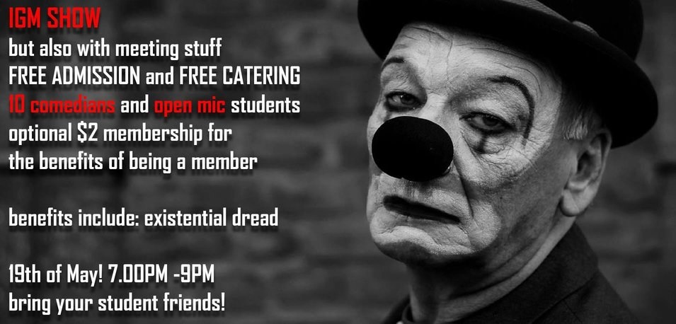 It's time for our first-ever general meeting! But this meeting isn't like ordinary boring club meetings because it's also a live comedy show! We want to introduce the students to some of the best local comedians and student comedians so ten local comics will be doing their tightest 5-minute set, and we're going to give audience members a chance to perform too in the open mic section! Between sets, Jarrod Moore (President) will be sliding in some of his own comedy, as well as (quickly) telling you about the club and taking votes for little things we have to organise. Your input is welcome, we're a club run by students for students, and with your help, we'll be putting on pro and open mic shows every fortnight!